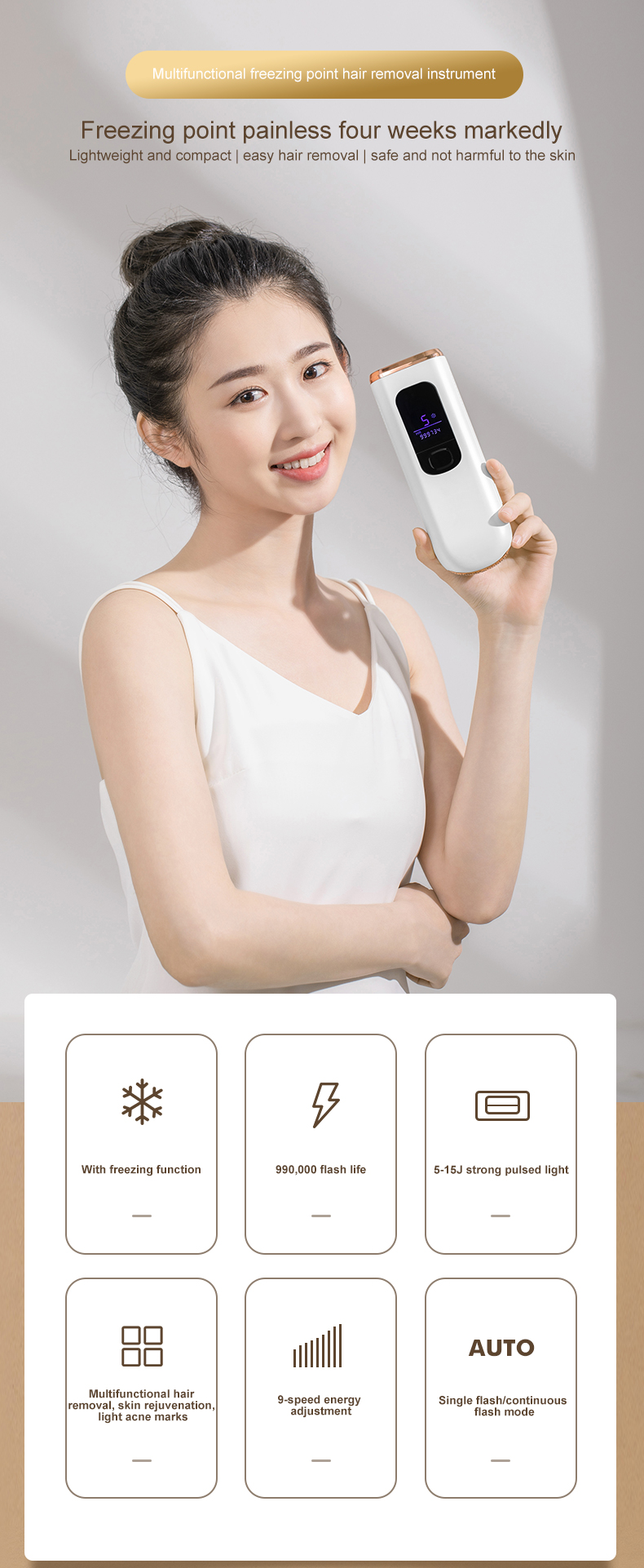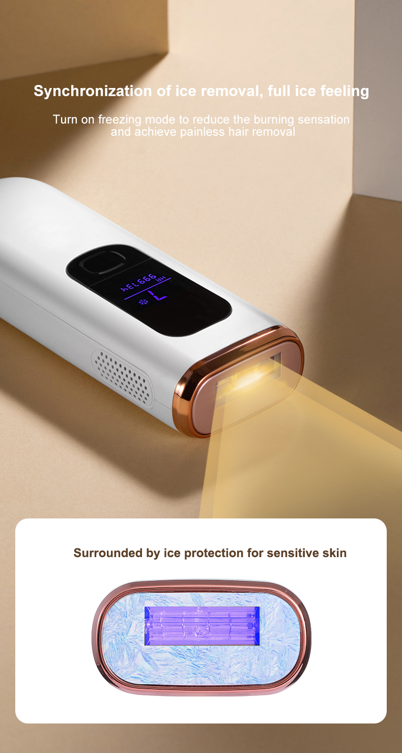 - Dapatkan hasil sehalus sutra di rumah. Ini mengadopsi teknologi sentuhan es safir tingkat klinis untuk menurunkan suhu dari 158℉ menjadi 67℉ pada titik kontak dengan kulit Anda.