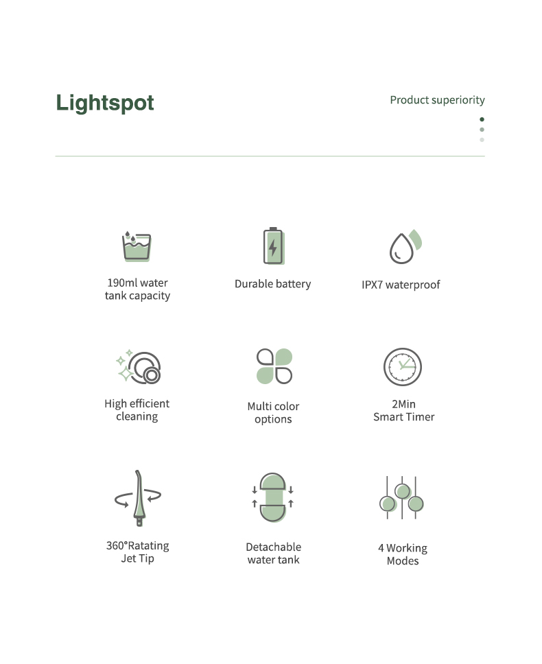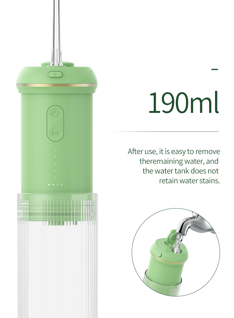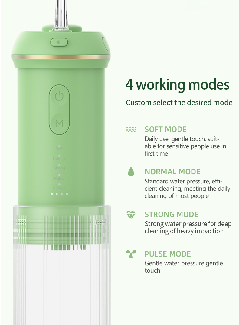 Pembersihan Mendalam dengan Tekanan Kuat: Benang gigi air ini mengadopsi teknik denyut terbaru untuk menawarkan 4 mode dengan rentang tekanan antara 30-90 Psi dan laju denyut 1400-1800 kali/menit, untuk menawarkan air berintensitas tinggi yang membersihkan 99,99% ketegangan gigi, dirancang khusus untuk periodontitis dan kawat gigi.