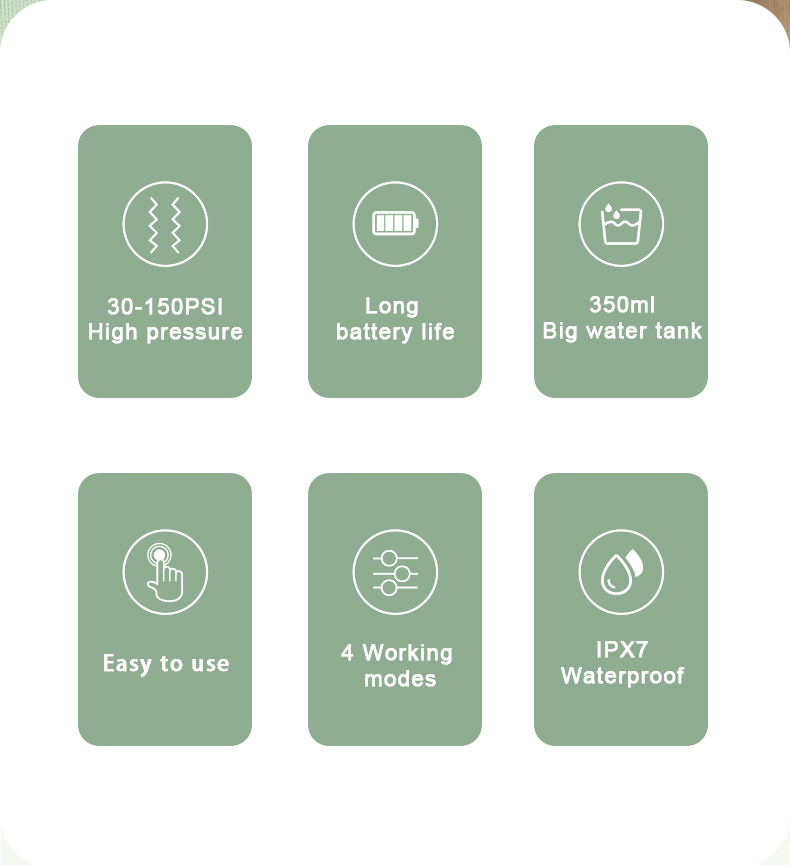 Pick gigi air nirkabel kami menawarkan kedap air yang unggul, memudahkan pembersihan dan penggunaan yang aman saat mandi.