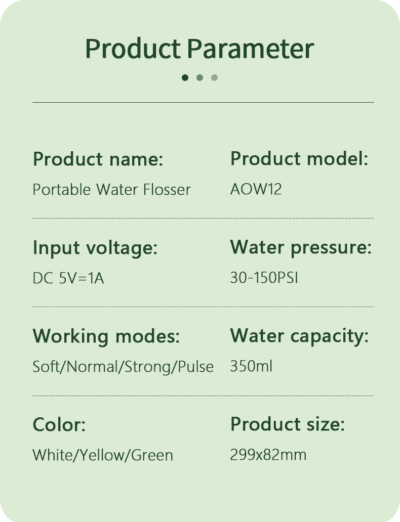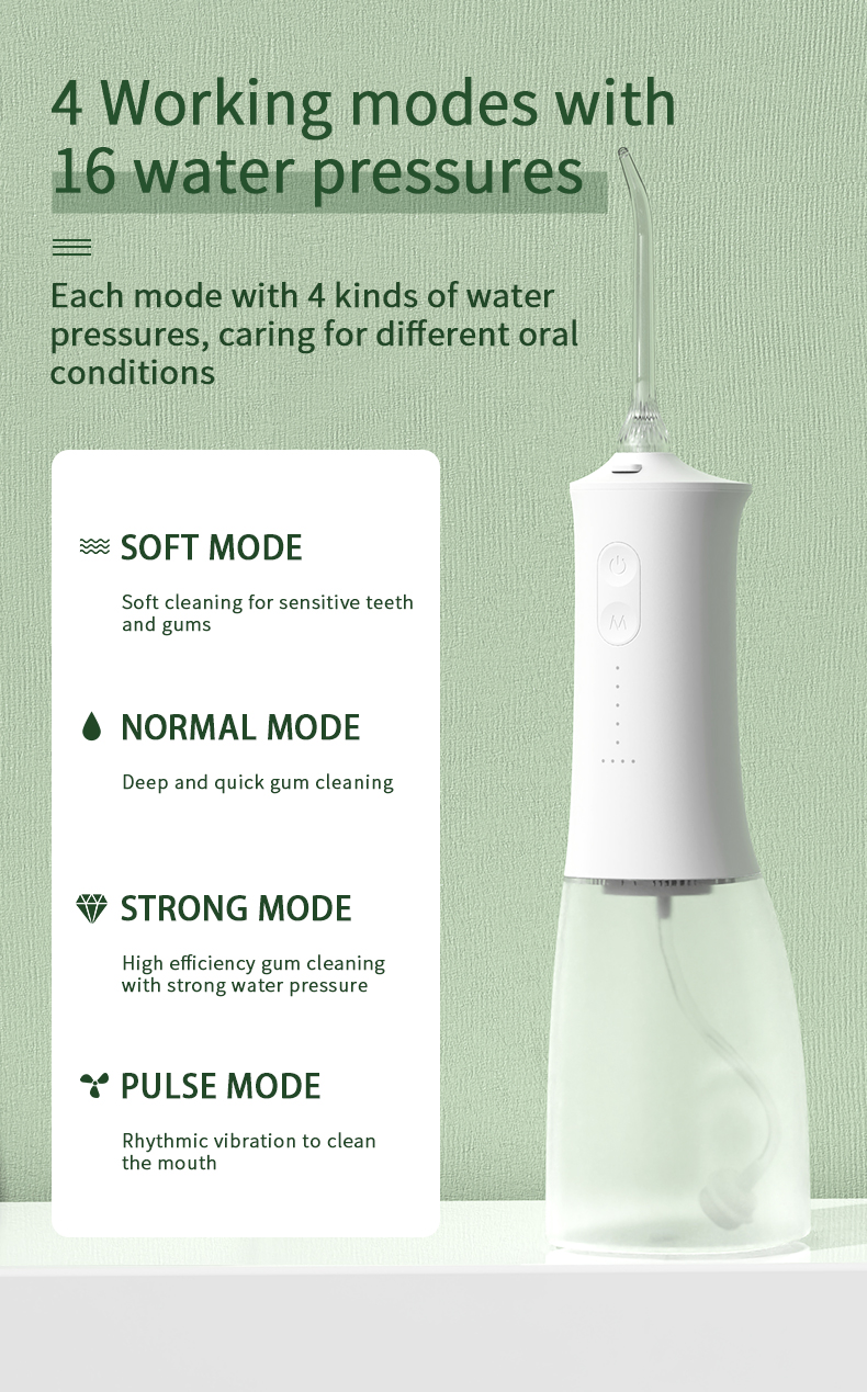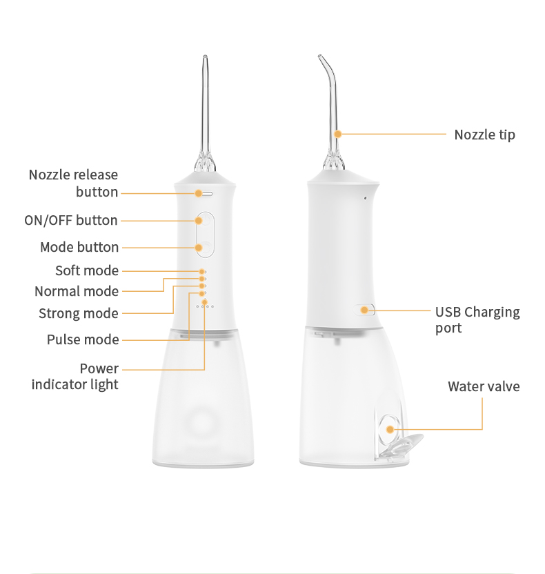Pick gigi air ini menghasilkan denyut bertekanan air tinggi 1400-1800 kali per menit, secara efektif menghilangkan 99,9% plak gigi untuk pembersihan gigi mendalam. Pembersih gigi air ini memijat gusi, meningkatkan sirkulasi darah, dan mengatasi masalah mulut seperti bau mulut, gigi ortodontik