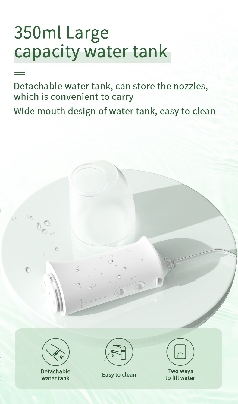 Flosser gigi air ini dilengkapi tangki air 350ml yang ditingkatkan, dua kali kapasitas model lama lainnya, menghilangkan kebutuhan untuk sering mengisi ulang dan membuat pembersihan mulut Anda lebih nyaman dan efisien
