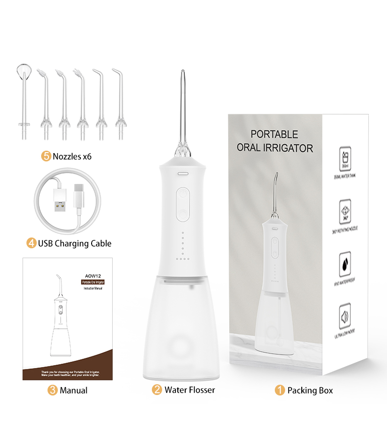 Paket: 1 buah badan benang gigi air + 5 buah ujung + 1 buah kabel USB + 1 buah buku petunjuk + 1 buah kotak hadiah.